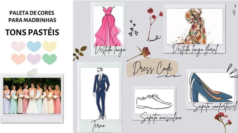 Padrinhos e madrinhas: as madrinhas irão na paleta de tons pasteis e os padrinhos irão de terno completo, mas sem nenhuma cor definida para eles.